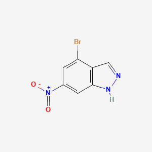 4-Bromo-6-nitro-1H-indazole (CAS: 885518-54-7) is a heterocyclic aromatic compound with the molecular formula C₇H₄BrN₃O₂. It features a bromine atom at the 4-position and a nitro group at the 6-position of the indazole core (a fused bicyclic structure comprising a benzene ring and a pyrazole ring). This compound is primarily utilized in pharmaceutical research and organic synthesis, particularly as a building block for drug discovery and as a ligand in catalytic systems .