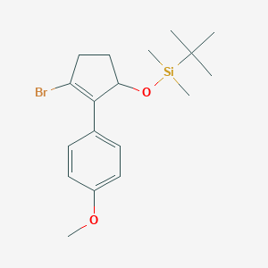 The mechanism of action of ((3-Bromo-2-(4-methoxyphenyl)cyclopent-2-EN-1-YL)oxy)(tert-butyl)dimethylsilane involves its interaction with specific molecular targets, such as enzymes or receptors. The bromine atom and the methoxyphenyl group play crucial roles in these interactions, influencing the compound’s binding affinity and specificity. The tert-butyl dimethylsilane moiety provides steric protection and enhances the compound’s stability.