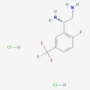 This chiral diamine derivative features a 2-fluoro-5-(trifluoromethyl)phenyl group attached to an ethane-1,2-diamine backbone, stabilized as a dihydrochloride salt. The trifluoromethyl (-CF₃) and fluorine substituents enhance lipophilicity and metabolic stability, while the dihydrochloride salt improves aqueous solubility.