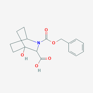 The mechanism of action for 2-((Benzyloxy)carbonyl)-4-hydroxy-2-azabicyclo[2.2.2]octane-3-carboxylic acid involves its interaction with specific molecular targets. The compound can act as a nucleophile or a base in various organic reactions . Its bicyclic structure allows it to participate in unique reaction pathways, often involving the formation of stable intermediates.