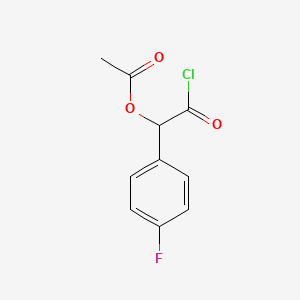 The mechanism of action of 2-Chloro-1-(4-fluorophenyl)-2-oxoethyl acetate involves its interaction with specific molecular targets. The chloro and fluorophenyl groups can interact with enzymes or receptors, potentially inhibiting their activity. The oxoethyl group may also play a role in binding to active sites of enzymes, affecting their function. The exact pathways and targets depend on the specific application and context of use.