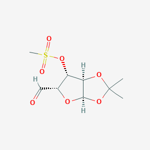 This compound, a stereochemically defined methanesulfonate derivative, serves as a critical intermediate in synthesizing 3-C-branched 3'-deoxynucleoside analogs . Its structure (C₁₁H₂₀O₈S) features a fused tetrahydrofurodioxolane core with a formyl group at position 5 and a mesylate (methanesulfonate) group at position 6 (Figure 1). The compound crystallizes in a monoclinic system (space group P2₁) with lattice parameters a = 5.5794 Å, b = 15.6118 Å, c = 8.0653 Å, and β = 98.913° . Hydrogen bonding between the formyl oxygen and adjacent hydroxyl groups stabilizes the crystal lattice .