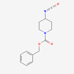 Solubility behavior of this compound is influenced by its structural features and functional group composition. The presence of the aromatic benzyl group contributes to hydrophobic character, while the polar carbamate and isocyanate groups provide hydrophilic character, resulting in amphiphilic properties. The compound is likely soluble in organic solvents such as dichloromethane, tetrahydrofuran, and acetonitrile, which can effectively solvate both the polar and nonpolar portions of the molecule. Water solubility is expected to be limited due to the predominance of hydrophobic character, particularly from the benzyl aromatic system and the saturated piperidine ring.
