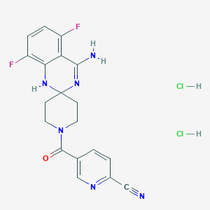 | IUPAC Name | 5-(4-amino-5,8-difluorospiro[1H-quinazoline-2,4'-piperidine]-1'-carbonyl)pyridine-2-carbonitrile; dihydrochloride |