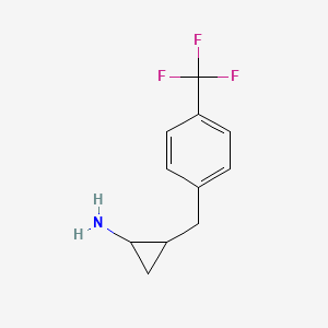 The mechanism of action of 2-{[4-(Trifluoromethyl)phenyl]methyl}cyclopropan-1-amine involves its interaction with specific molecular targets, such as enzymes or receptors. The trifluoromethyl group enhances the compound’s lipophilicity, allowing it to penetrate cell membranes more effectively. Once inside the cell, it can interact with its target, modulating its activity and leading to the desired biological effect. The exact pathways involved depend on the specific application and target.