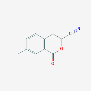 The synthesis of 7-Methyl-1-oxo-3,4-dihydro-1H-2-benzopyran-3-carbonitrile typically involves the cyclization of appropriate precursors under controlled conditions. One common method involves the reaction of 7-methylcoumarin with a nitrile source in the presence of a base. The reaction is usually carried out in an organic solvent such as dimethylformamide or acetonitrile at elevated temperatures.