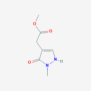 The synthesis of Methyl 2-(2-methyl-3-oxo-2,3-dihydro-1H-pyrazol-4-yl)acetate typically involves the reaction of ethyl acetoacetate with hydrazine hydrate to form the pyrazolone intermediate. This intermediate is then esterified using methanol in the presence of an acid catalyst to yield the final product. The reaction conditions often include refluxing the mixture for several hours to ensure complete conversion.