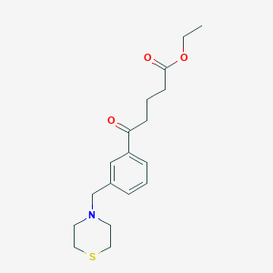 Ethyl 5-oxo-5-[3-(thiomorpholinomethyl)phenyl]valerate is a heterocyclic organic compound with a complex molecular architecture. Its systematic IUPAC name reflects its structural components: ethyl 5-oxo-5-[3-(4-thiomorpholinylmethyl)phenyl]pentanoate . The compound belongs to the class of thiomorpholine derivatives, characterized by a six-membered ring containing both nitrogen and sulfur atoms.