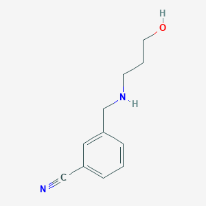 The synthesis of 3-{[(3-Hydroxypropyl)amino]methyl}benzonitrile typically involves the reaction of benzonitrile with 3-hydroxypropylamine under controlled conditions . The reaction is usually carried out in the presence of a catalyst and under an inert atmosphere to prevent unwanted side reactions. Industrial production methods may involve bulk synthesis techniques, ensuring high purity and yield .