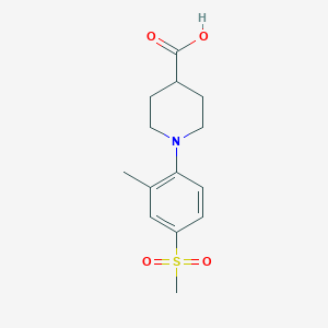 The exact mechanism of action of 1-[2-Methyl-4-(methylsulphonyl)phenyl]piperidine-4-carboxylic acid depends on its specific application. In medicinal chemistry, it may interact with molecular targets such as enzymes or receptors, modulating their activity. The methylsulfonyl group can enhance the compound’s ability to form hydrogen bonds, increasing its binding affinity to target proteins. The piperidine ring provides structural rigidity, which can influence the compound’s pharmacokinetic properties.