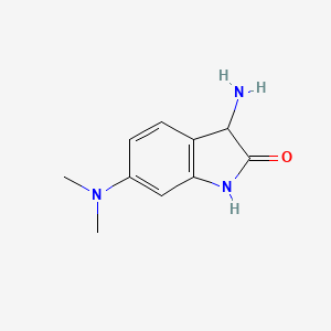 The synthesis of 3-amino-6-(dimethylamino)-2,3-dihydro-1H-indol-2-one typically involves multi-step organic reactions. One common method includes the cyclization of appropriate precursors under controlled conditions. For instance, starting from a substituted aniline, the compound can be synthesized through a series of reactions involving nitration, reduction, and cyclization .