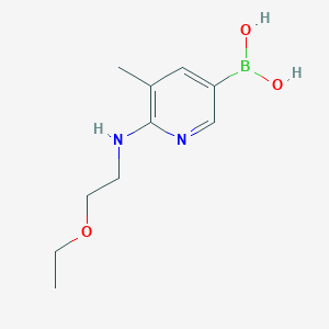 “(6-((2-Ethoxyethyl)amino)-5-methylpyridin-3-yl)boronic acid” is a boronic acid derivative with a pyridine ring substituted at the 3-position. The compound contains a boron atom attached to the pyridine nitrogen and an ethoxyethylamine group. Boronic acids are versatile compounds known for their reactivity in organic synthesis and medicinal chemistry.
