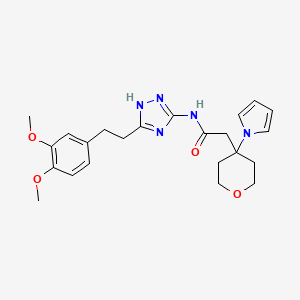 N-{5-[2-(3,4-dimethoxyphenyl)ethyl]-1H-1,2,4-triazol-3-yl}-2-[4-(1H-pyrrol-1-yl)tetrahydro-2H-pyran-4-yl]acetamide is a complex organic compound that features a triazole ring, a pyrrole ring, and a tetrahydropyran ring