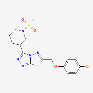 The compound contains a fused [1,2,4]triazolo[3,4-b][1,3,4]thiadiazole core, a 4-bromophenyl group, a methylsulfonyl-piperidine moiety, and a methyl ether linkage. The triazole-thiadiazole system provides π-conjugation and hydrogen-bonding capabilities, while the bromophenyl group enhances electrophilic substitution potential. The methylsulfonyl group on piperidine increases solubility and influences intermolecular interactions. Structural characterization relies on NMR, IR, and MS to confirm regiochemistry and purity .
