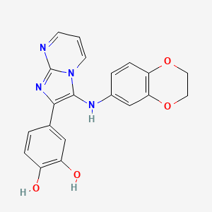 4-[3-(2,3-Dihydro-1,4-benzodioxin-6-ylamino)imidazo[1,2-a]pyrimidin-2-yl]-1,2-benzenediol is a complex organic compound that features a unique combination of benzodioxin, imidazopyrimidine, and benzenediol moieties. This compound is of significant interest in the fields of medicinal chemistry and pharmacology due to its potential therapeutic applications.