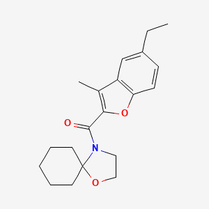 The mechanism of action of 4-[(5-ethyl-3-methyl-1-benzofuran-2-yl)carbonyl]-1-oxa-4-azaspiro[4.5]decane involves its interaction with specific molecular targets, such as enzymes or receptors. The compound may bind to these targets, modulating their activity and triggering a cascade of biochemical events. The exact pathways and molecular targets can vary depending on the specific application and biological context.
