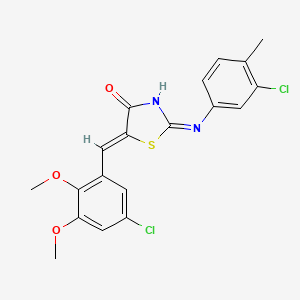 The synthesis of 5-(5-chloro-2,3-dimethoxybenzylidene)-2-[(3-chloro-4-methylphenyl)imino]-1,3-thiazolidin-4-one typically involves the condensation of 5-chloro-2,3-dimethoxybenzaldehyde with 3-chloro-4-methylaniline in the presence of a thiazolidinone-forming reagent. Common reagents include acetic acid and sulfur, and the reaction is usually carried out under reflux conditions.