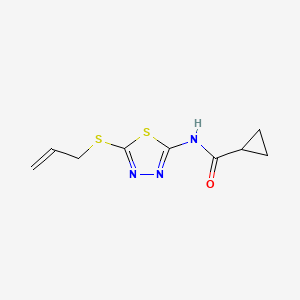 The synthesis of N-[5-(prop-2-en-1-ylsulfanyl)-1,3,4-thiadiazol-2-yl]cyclopropanecarboxamide typically involves the reaction of 5-(prop-2-en-1-ylsulfanyl)-1,3,4-thiadiazole with cyclopropanecarboxylic acid chloride in the presence of a base such as triethylamine. The reaction is carried out under anhydrous conditions and at a controlled temperature to ensure the formation of the desired product.