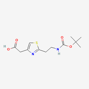 This compound belongs to the class of thiazole acetic acid derivatives, characterized by a 1,3-thiazole ring substituted at the 2-position with a tert-butoxycarbonyl (Boc)-protected aminoethyl group and at the 4-position with an acetic acid moiety. The Boc group serves as a protective moiety for amines, enhancing stability during synthetic processes, particularly in peptide and heterocyclic chemistry .