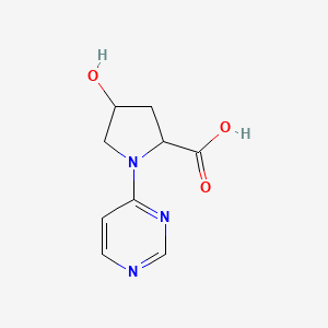 The synthesis of 4-Hydroxy-1-(pyrimidin-4-yl)pyrrolidine-2-carboxylic acid can be achieved through several synthetic routes. One common method involves the reaction of pyrimidine derivatives with pyrrolidine derivatives under specific reaction conditions. The reaction typically requires the use of catalysts and solvents to facilitate the formation of the desired product. Industrial production methods may involve large-scale synthesis using optimized reaction conditions to ensure high yield and purity of the compound .
