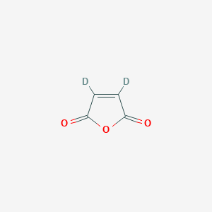 Maleic anhydride-d₂ (C₄D₂O₃) is synthesized via deuteration of maleic anhydride using deuterated reagents (e.g., D₂O or deuterated acids). Isotopic purity (>98% deuterium incorporation) is critical for applications in kinetic isotope effect studies or NMR spectroscopy. Validation methods include: