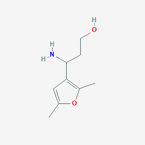 3-Amino-3-(2,5-dimethylfuran-3-yl)propan-1-ol is an amino alcohol derivative featuring a furan ring substituted with methyl groups at positions 2 and 5. The compound’s structure combines a propan-1-ol backbone with an amino group and a heteroaromatic substituent at the third carbon.