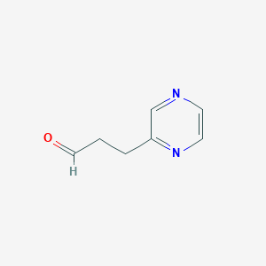 The polarized carbon-oxygen double bond of the aldehyde in 3-(Pyrazin-2-yl)propanal allows for nucleophilic addition reactions. Strong nucleophiles, such as Grignard reagents or organolithium compounds, can attack the carbonyl carbon to form secondary alcohols.
