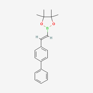 The mechanism of action of (E)-2-(2-([1,1’-Biphenyl]-4-yl)vinyl)-4,4,5,5-tetramethyl-1,3,2-dioxaborolane primarily involves its role as a boronic ester in cross-coupling reactions. The boron atom forms a complex with the palladium catalyst, facilitating the transfer of the organic group to the halide substrate. This process involves several steps, including oxidative addition, transmetalation, and reductive elimination, leading to the formation of the desired carbon-carbon bond.
