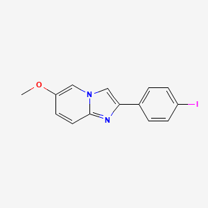 2-(4-Iodophenyl)-6-methoxyimidazo[1,2-a]pyridine is a heterocyclic compound featuring an imidazo[1,2-a]pyridine core substituted with a 4-iodophenyl group at position 2 and a methoxy group at position 4. This compound is of interest due to its structural similarity to pharmacologically active imidazo[1,2-a]pyridine derivatives, which exhibit diverse biological activities, including antimicrobial, anticancer, and neuroleptic properties . The iodine atom at the para position of the phenyl ring and the methoxy group on the pyridine ring contribute to its unique electronic and steric properties, influencing reactivity, binding affinity, and pharmacokinetics.