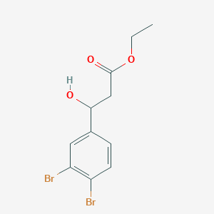 Ethyl 3-(3,4-dibromophenyl)-3-hydroxypropanoate is an organobromine compound featuring a 3,4-dibrominated phenyl ring attached to a β-hydroxypropanoate ester backbone. The molecular formula is C₁₁H₁₂Br₂O₃, with a calculated molecular weight of 352.03 g/mol. The compound’s structure combines a hydroxy group at the β-position of the propanoate chain and two bromine atoms at the 3- and 4-positions of the aromatic ring.