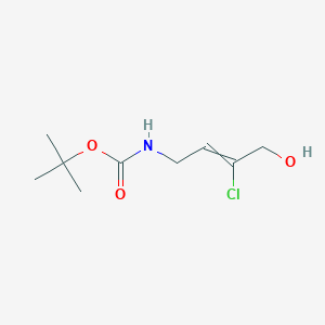 (Z)-4-(Boc-amino)-2-chloro-2-buten-1-ol is a chiral amino alcohol derivative characterized by a tert-butoxycarbonyl (Boc)-protected amine group at the C4 position, a chlorine substituent at C2, and a hydroxyl group at C1. The compound features a conjugated double bond between C2 and C3, with a (Z)-stereochemistry, indicating that the Boc-amino (C4) and chlorine (C2) substituents reside on the same side of the double bond.