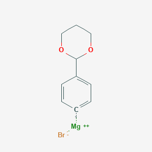 This compound is a functionalized aryl Grignard reagent that exemplifies modern synthetic strategies. Its structure incorporates a phenyl ring, the Grignard functionality (MgBr), and a 1,3-dioxane (B1201747) ring. This dioxane group is a cyclic acetal (B89532), which serves as a protecting group for an aldehyde. This feature is crucial as it allows the powerful nucleophilicity of the Grignard reagent to be utilized in the presence of a latent carbonyl group, which would otherwise be incompatible.