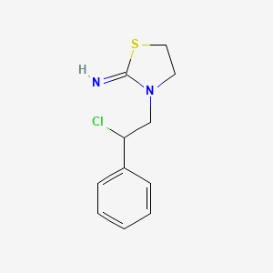 3-(2-Chloro-2-phenylethyl)-1,3-thiazolidin-2-imine is a heterocyclic compound featuring a thiazolidine ring fused with an imine group. The molecule contains a 2-chloro-2-phenylethyl substituent attached to the nitrogen atom of the thiazolidine ring. Its exact mass is reported as 240.0035044, and it is often utilized in reactions involving nucleophilic substitution due to the reactive chlorine atom in the phenylethyl group .