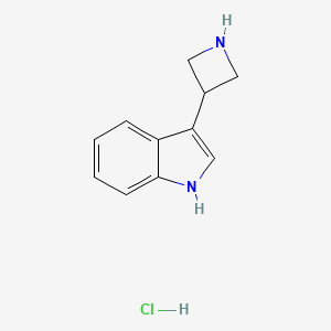 3-(Azetidin-3-yl)-1H-indole hydrochloride is a heterocyclic compound comprising an indole core fused to an azetidine ring. The indole moiety consists of a bicyclic structure with a benzene ring fused to a pyrrole ring, while the azetidine group is a four-membered nitrogen-containing ring. The hydrochloride salt form enhances solubility and stability, making it suitable for pharmaceutical applications. This compound is commercially available as a pharmaceutical intermediate, as indicated by its listing in chemical catalogs (100 mg, USD 318) .