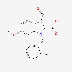 The synthesis of Methyl 3-formyl-6-methoxy-1-(2-methylbenzyl)-1H-indole-2-carboxylate typically involves multi-step organic reactions. One common method starts with the preparation of the indole core, followed by the introduction of the formyl, methoxy, and methylbenzyl groups through a series of reactions such as Friedel-Crafts acylation, methylation, and formylation. The final step often involves esterification to introduce the carboxylate group.
