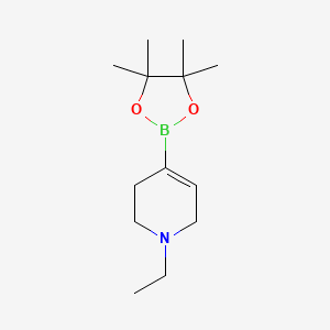 1-Ethyl-4-(4,4,5,5-tetramethyl-1,3,2-dioxaborolan-2-yl)-1,2,3,6-tetrahydropyridine is a boron-containing heterocyclic compound featuring a partially saturated pyridine ring (1,2,3,6-tetrahydropyridine) substituted with an ethyl group at the 1-position and a pinacol boronate ester (4,4,5,5-tetramethyl-1,3,2-dioxaborolane) at the 4-position. This structure confers unique reactivity, particularly in transition-metal-catalyzed cross-coupling reactions such as Suzuki-Miyaura couplings, which are pivotal in pharmaceutical and materials chemistry . The tetrahydropyridine scaffold enhances stability compared to fully unsaturated pyridines, while the boronate ester enables versatile functionalization.