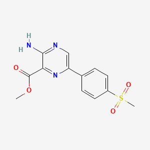 Methyl 3-amino-6-(4-(methylsulfonyl)phenyl)pyrazine-2-carboxylate is synthesized through various chemical reactions involving pyrazine derivatives. The synthesis often involves the use of reagents such as palladium catalysts and boron compounds to facilitate coupling reactions. For example, the compound can be prepared by reacting 3-amino-6-bromo-pyrazine derivatives with methylsulfonyl phenyl boronates under microwave conditions, yielding high purity products through reverse-phase HPLC purification techniques .