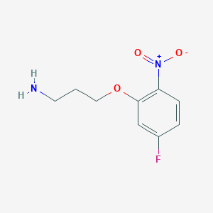 The mechanism of action of 3-(5-Fluoro-2-nitrophenoxy)propan-1-amine involves its interaction with specific molecular targets, such as enzymes or receptors. The compound may act as an inhibitor or activator, modulating the activity of these targets and influencing various biochemical pathways. The presence of the fluorine and nitro groups can enhance its binding affinity and specificity towards certain targets, leading to its observed biological effects .