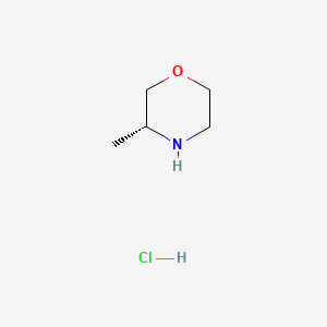 This compound is the hydrochloride salt of the chiral amine (R)-3-Methylmorpholine. The core structure consists of a saturated six-membered morpholine ring, which contains both an ether linkage (-O-) and a secondary amine (-NH-). The defining feature is a methyl group attached to the carbon at position 3. The "(R)" designation specifies the absolute stereochemistry at this chiral center, which is crucial for its application in asymmetric synthesis and for its specific interactions with biological targets. The positive charge on the protonated morpholine nitrogen is balanced by a chloride counter-ion.