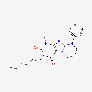 3-Hexyl-1,7-dimethyl-9-phenyl-1H,2H,3H,4H,6H,7H,8H,9H-pyrimido[1,2-g]purine-2,4-dione is a complex organic compound belonging to the class of pyrimidopurines This compound is characterized by its unique structure, which includes a hexyl chain, two methyl groups, and a phenyl group attached to a pyrimidopurine core