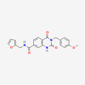 The synthesis of N-(furan-2-ylmethyl)-3-(4-methoxybenzyl)-2,4-dioxo-1,2,3,4-tetrahydroquinazoline-7-carboxamide typically involves multiple steps, starting from readily available starting materials. The key steps include the formation of the quinazoline core, followed by the introduction of the furan-2-ylmethyl and 4-methoxybenzyl groups. The reaction conditions often involve the use of strong acids or bases, high temperatures, and prolonged reaction times to ensure complete conversion of the starting materials to the desired product.