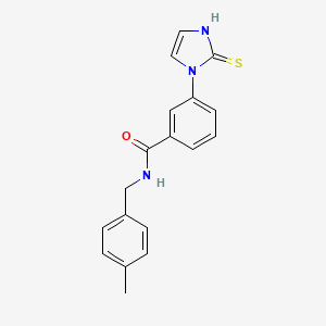 N-[(4-Methylphenyl)methyl]-3-(2-sulfanyl-1H-imidazol-1-yl)benzamide (CAS: 1146289-99-7) is a sulfur-containing heterocyclic compound with the molecular formula C₁₈H₁₇N₃OS and a molecular weight of 323.41 g/mol. Its structure comprises a benzamide core substituted with a 2-sulfanyl-imidazole moiety at the 3-position and a 4-methylbenzyl group at the amide nitrogen (). This compound is commercially available (Santa Cruz Biotechnology, sc-355009) for research use, with pricing tiers for 250 mg ($197.00) and 1 g ($399.00) quantities ().
