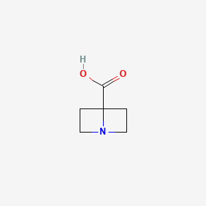 1-Azabicyclo[2.2.0]hexane-4-carboxylic acid (CAS: 733704-21-7) is a bicyclic amino acid with a rigid norbornane-like scaffold. Its molecular formula is C₆H₉NO₂ (molecular weight: 127.14 g/mol), featuring a bridgehead nitrogen atom and a carboxylic acid substituent at the 4-position . This compound is commercially available for research applications, marketed as a building block in organic synthesis and medicinal chemistry . Its conformationally constrained structure makes it valuable for studying peptide mimetics and enzyme inhibitors.
