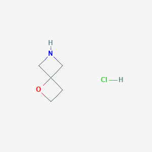 1-Oxa-6-azaspiro[3.3]heptane hydrochloride, also known as 3,3-dimethyl-1-oxa-6-azaspiro[3.3]heptane hydrochloride, is a compound characterized by its unique spirocyclic structure that incorporates both oxygen and nitrogen atoms. This structural feature is believed to contribute to its diverse biological activities, making it a subject of interest in medicinal chemistry and pharmacology.