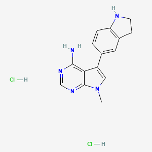 5-(2,3-Dihydro-1H-indol-5-yl)-7-methyl-7H-pyrrolo[2,3-d]pyrimidin-4-amine dihydrochloride acts as a potent inhibitor of receptor-interacting protein kinase 1 (RIPK1). This compound binds to the kinase domain of RIPK1 with high affinity, thereby inhibiting its activity. The inhibition of RIPK1 by this compound prevents the phosphorylation of downstream substrates, which are involved in necroptosis and inflammatory signaling pathways. Additionally, this compound has shown good kinase selectivity, meaning it specifically targets RIPK1 without significantly affecting other kinases.