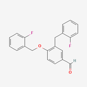 3-(2-Fluorobenzyl)-4-(2-fluorobenzyloxy)benzaldehyde is an organic compound characterized by its unique structure, featuring a benzaldehyde core with two fluorobenzyl substituents. This compound has garnered attention in the field of medicinal chemistry due to its potential biological activities, particularly in drug development and synthesis of complex organic molecules.