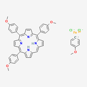 Iron(3+); methoxybenzene; 10,15,20-tris(4-methoxyphenyl)-21,22-dihydroporphyrin; dichloride, commonly referred to as 5,10,15,20-tetrakis(4-methoxyphenyl)porphyrin iron(III) chloride (FeTMPPCl), is a metalloporphyrin compound with significant biological activity. This article explores its properties, mechanisms of action, and applications in various biological contexts.