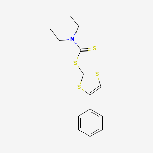 The synthesis of 4-Phenyl-2H-1,3-dithiol-2-yl diethylcarbamodithioate typically involves the reaction of phenyl-substituted dithioles with diethylcarbamodithioate. One common method includes the use of elemental sulfur and appropriate organic reagents under controlled conditions to form the desired dithiole ring structure. Industrial production methods may involve large-scale synthesis using optimized reaction conditions to ensure high yield and purity of the compound .