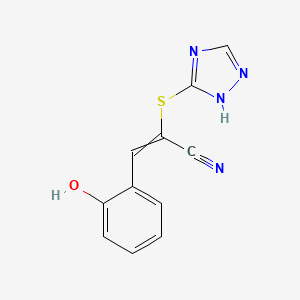 The synthesis of 3-(2-Hydroxyphenyl)-2-[(1H-1,2,4-triazol-5-yl)sulfanyl]prop-2-enenitrile typically involves multi-step organic reactions. One common method starts with the preparation of the 2-hydroxyphenyl derivative, followed by the introduction of the triazole ring through a cyclization reaction. The final step involves the formation of the propenenitrile moiety via a condensation reaction with appropriate reagents under controlled conditions.