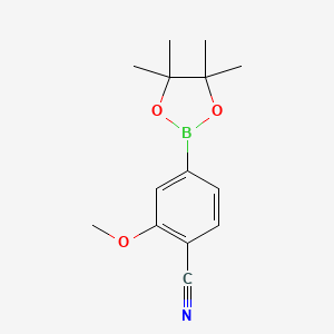 The mechanism of action of 2-Methoxy-4-(4,4,5,5-tetramethyl-1,3,2-dioxaborolan-2-yl)benzonitrile in Suzuki-Miyaura cross-coupling reactions involves the formation of a palladium-boron complex. This complex undergoes transmetalation with an aryl halide, followed by reductive elimination to form the desired biaryl product. The methoxy and nitrile groups can also participate in various chemical transformations, contributing to the compound’s versatility in organic synthesis.